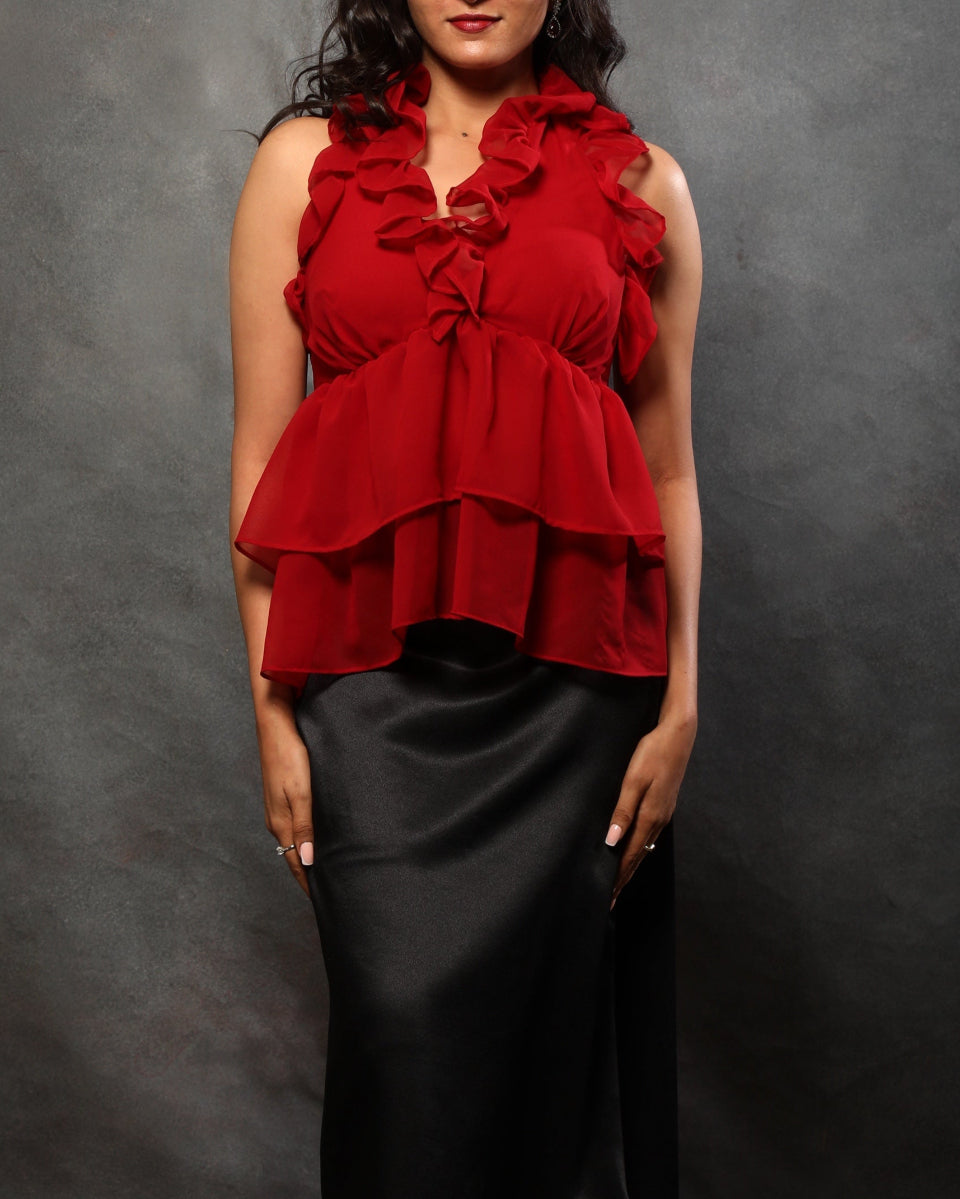 Effortlessly chic and versatile, the Blair Ruffle Top is a must-have for any fashion-forward woman. Crafted from lightweight georgette, this top combines style and comfort, making it perfect for any occasion.
